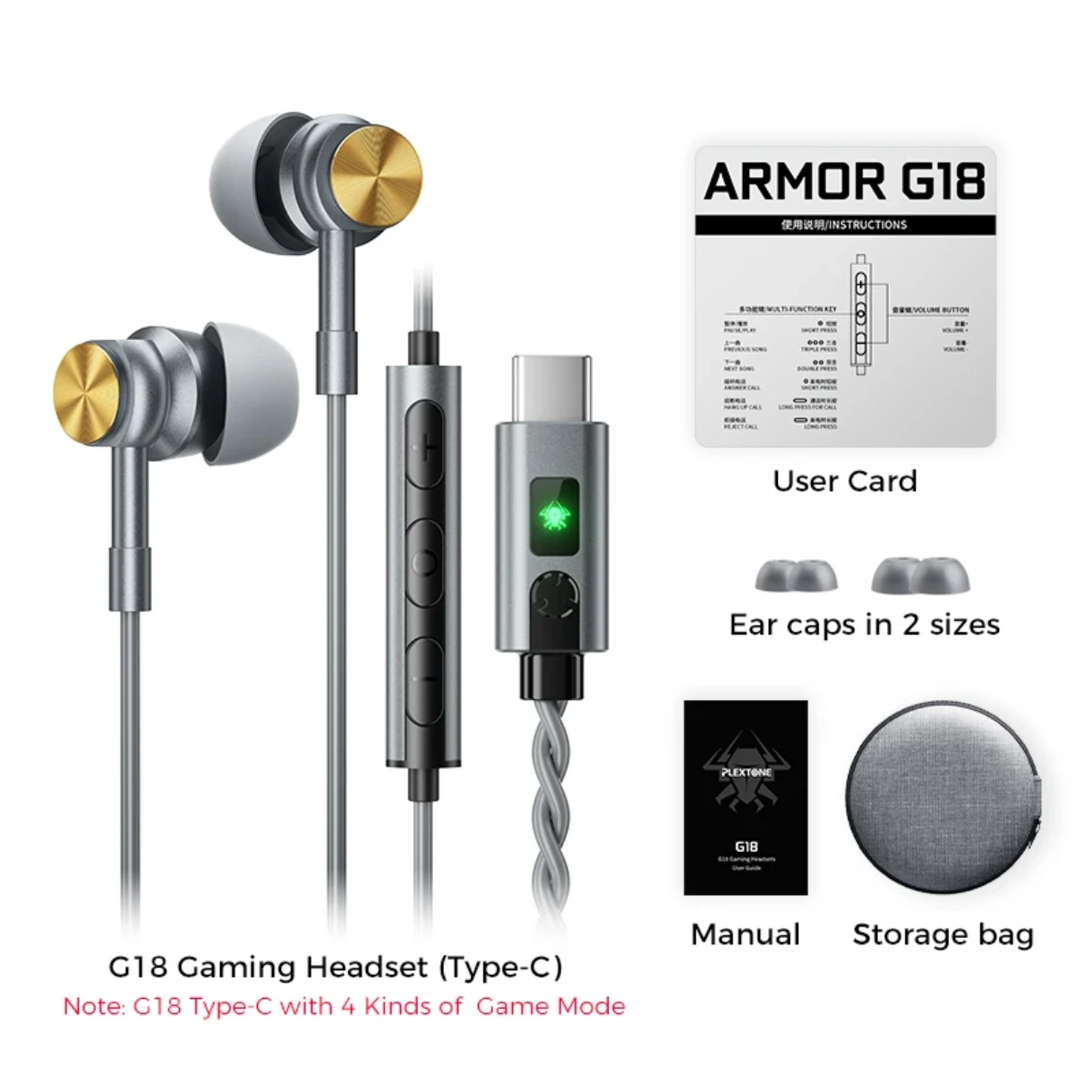 PLEXTONE G18 In-Ear للألعاب تقدم صوت Bass قوي و4 تأثيرات صوتية مخصصة للألعاب، مثالية للبث المباشر وتحديد مكان الأصوات بدقة 7.1