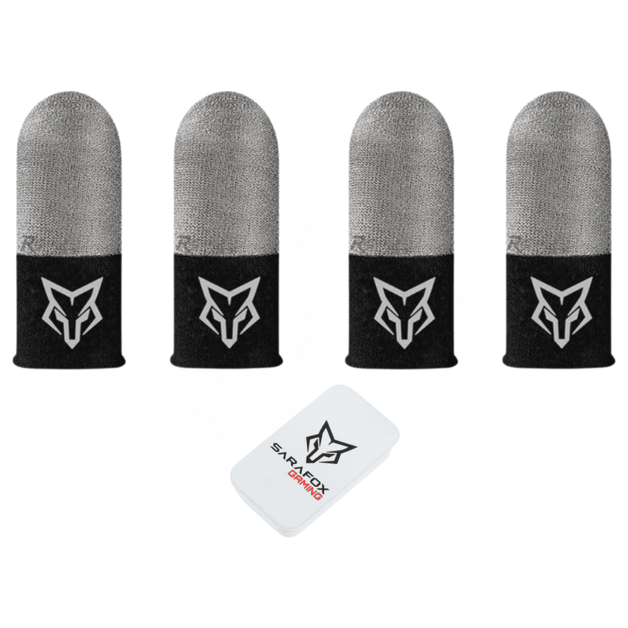 أصابع الألعاب Sarafox V8 الاحترافية. تقنية ألياف فضية زجاجية توفر حساسية عالية واحتكاك ثابت. مرنة جداً وتناسب الجميع. تحتوي على 4 قطع مع علبة معدنية
