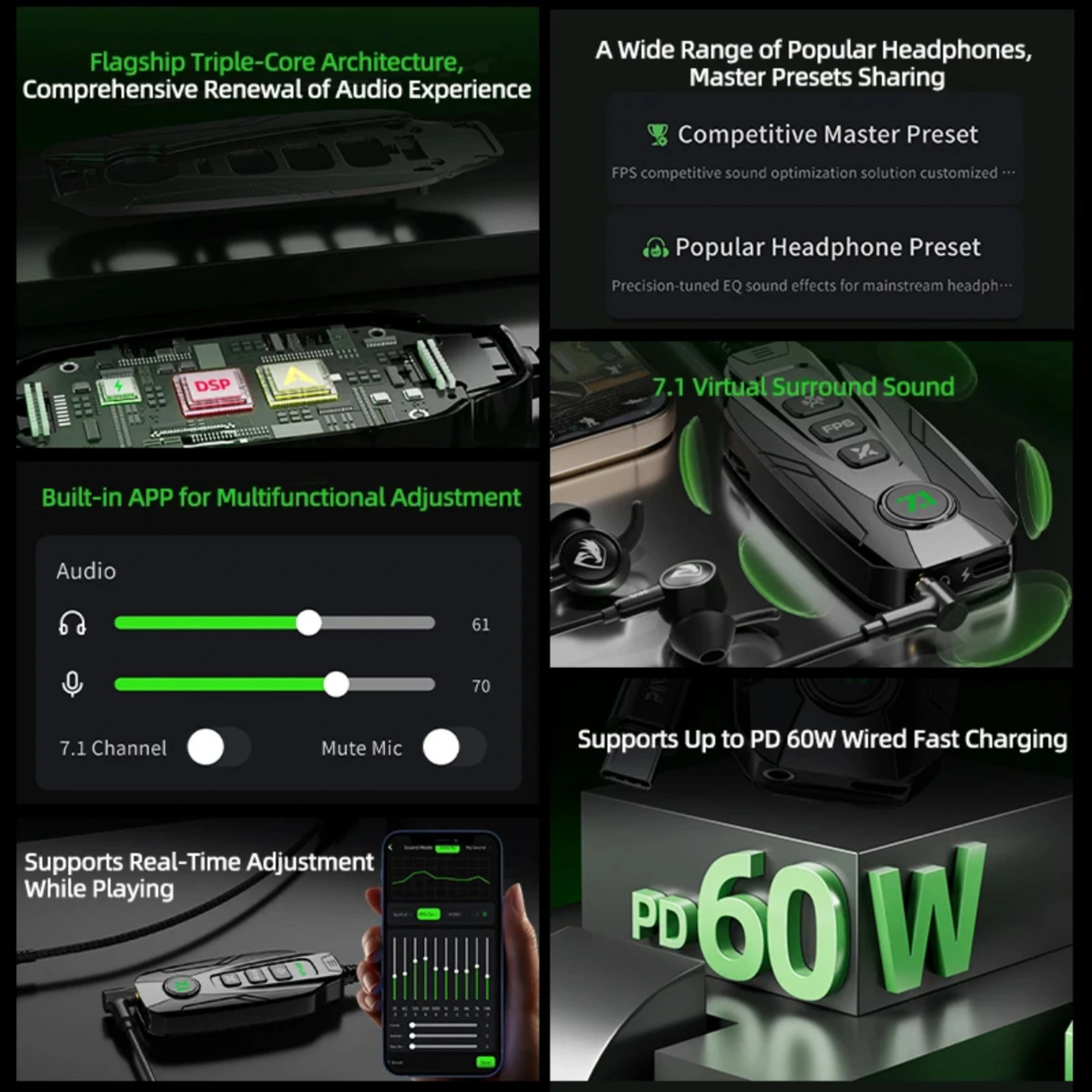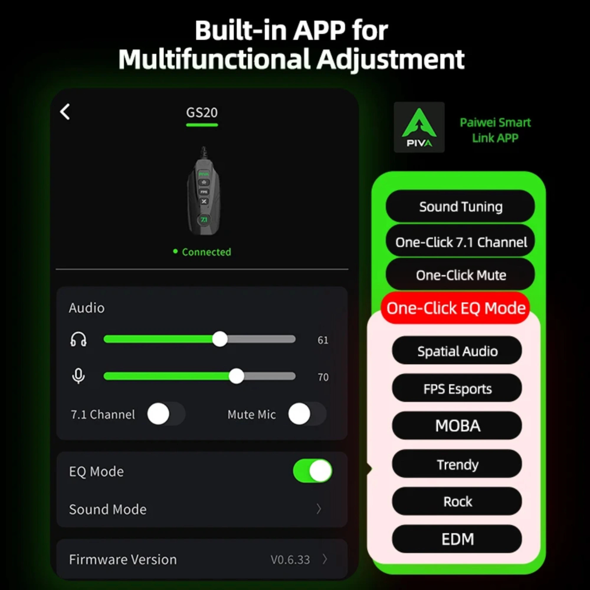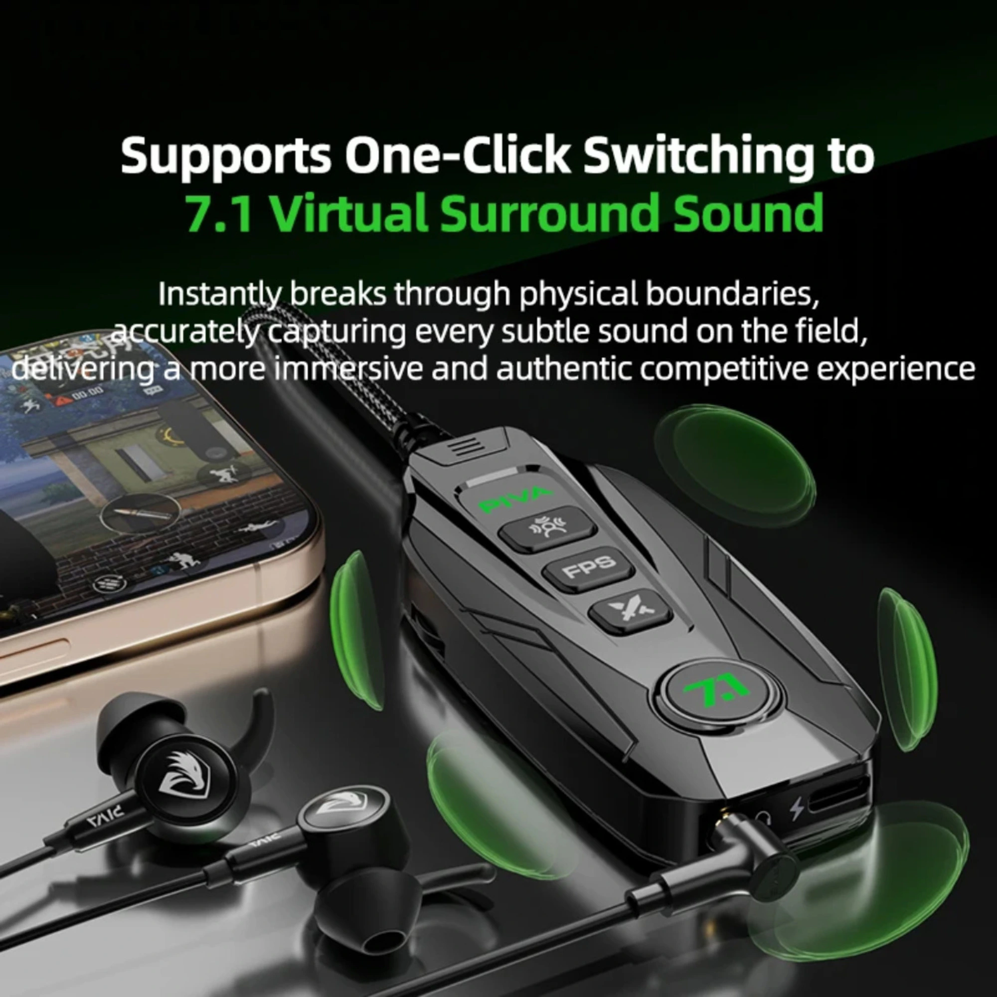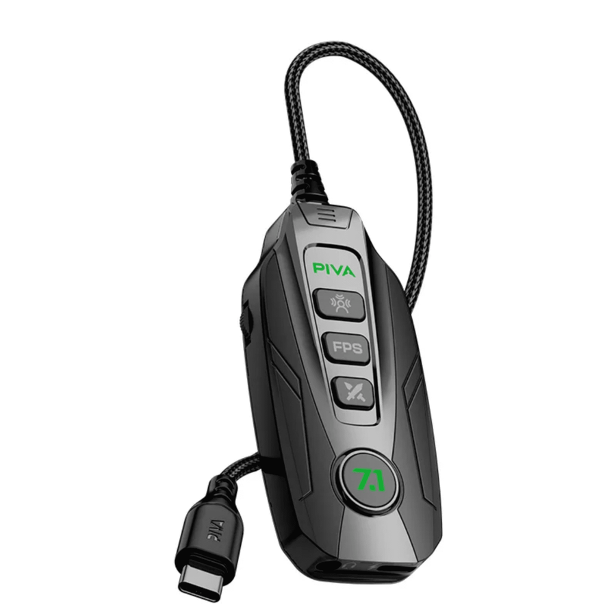 كارت صوت PIVA GS20 الاحترافي للجيمرز. صوت محيطي 7.1 افتراضي 360° لتحديد الأعداء بدقة. تحكم كامل في الإعدادات عبر تطبيق ذكي. شحن سريع PD 60W أثناء اللعب